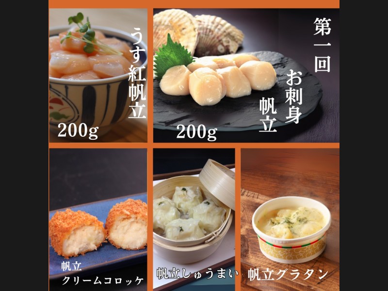 サイズ: 第一回:帆立玉冷200g。薄紅帆立玉冷200g、帆立グラタン1個、帆立しゅうまい4個入、帆立クリームコロッケ3個入