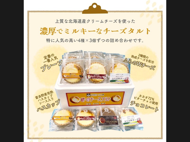 サイズ: 峠のチーズタルト・プレーン、ハスカップ、ふらのWチーズ、チョコレート 各3個入り 計12個セット