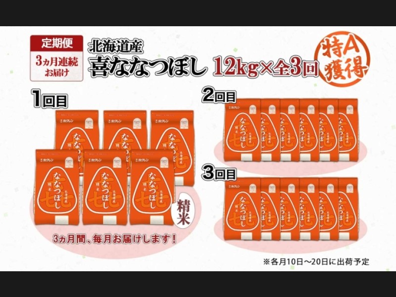 定期便 3ヵ月連続3回 北海道産 喜ななつぼし 精米 2kg×6袋 計12kg 米 特A 白米 小分け お取り寄せ なな...