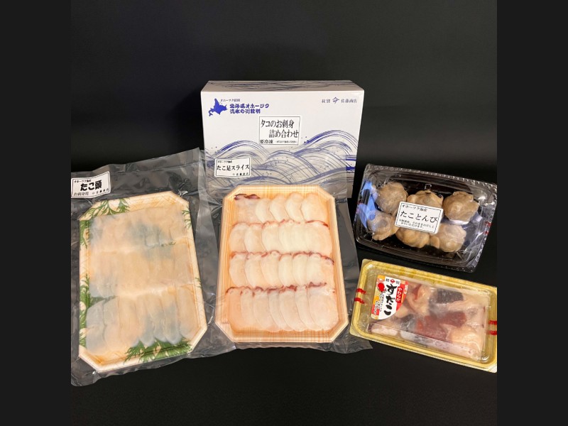 サイズ: タコ足スライス130g、タコ頭スライス100g、酢ダコ80g、タコトンビ6個(150g前後)