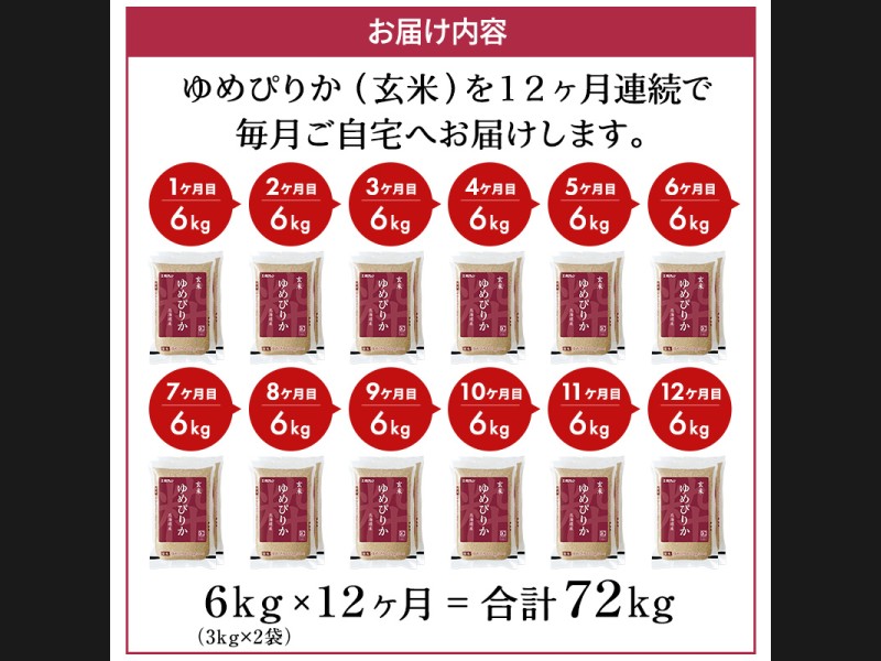 12ヵ月 定期便 ホクレンゆめぴりか(玄米6kg(3kg×2袋))ANA機内食採用 お米 米 ごはん 玄米 国産 北海...