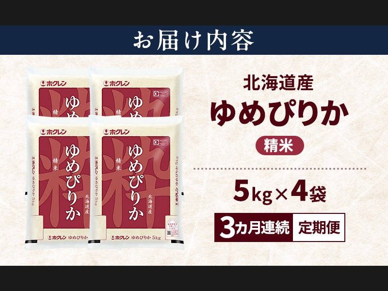 サイズ: ホクレン ゆめぴりか 精米 20kg(5kg×4袋)を3ヵ月連続で毎月10~20日にお届けします。