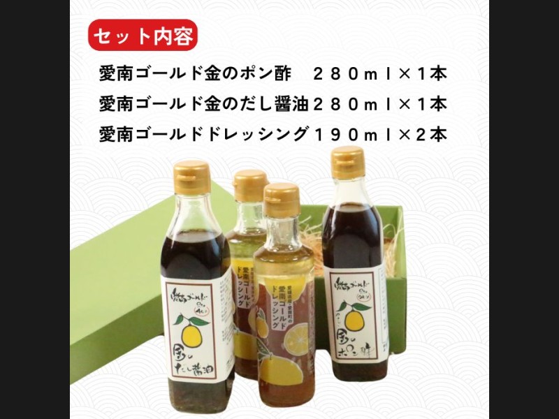 サイズ: 愛南ゴールドドレッシング190ml×2本、愛南ゴールドやさしい金のポン酢280ml×1本 愛南ゴールド金のだし醤油280ml×1本