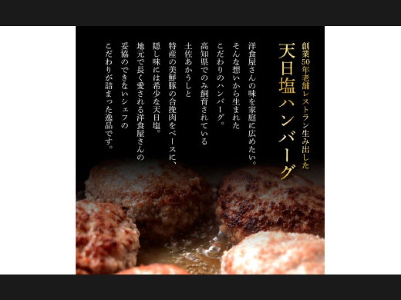 洋食屋さんの味を家庭に広めたい!そんな思いから玉ねぎのソテーから肉や素材の厳選、ソース作りまで店舗と同じ手法で手間を惜しまず開発しました。玉ねぎの細胞を傷つけず、水分と旨みを閉じ込める熟練のカッティング、ジューシーな肉汁を最高に引き出す肉のブレンド。そして隠し味に、希少な天然塩。深いコクがありながらあっさりとした舌触り。地元で長く愛されている味だからこそ、妥協できないシェフのこだわりが詰まったハンバーグです。素材の良さを楽しむ「天日塩ハンバーグ」、昔ながらの洋食屋さんの味「自家製デミグラスソース付天日塩ハンバーグ」、シェフの技術が詰まった高知県特産の最高級生姜使用「天日塩ハンバーグ 黄金しょうが和風ソース付」の3種類セットです。お忙しい毎日や、ハレの日、大勢の来客時にも気軽に対応できる<シェフの味>いかがでしょうか?