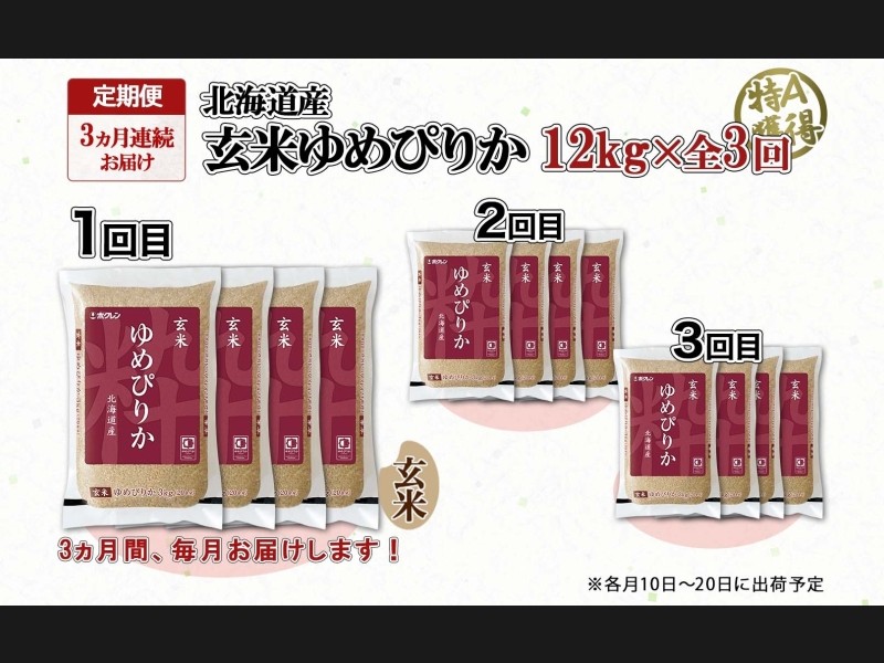 定期便 3ヵ月連続3回 北海道産 ゆめぴりか 玄米 3kg×4袋 計12kg 小分け 米 特A 国産 ごはん グルメ 食物...