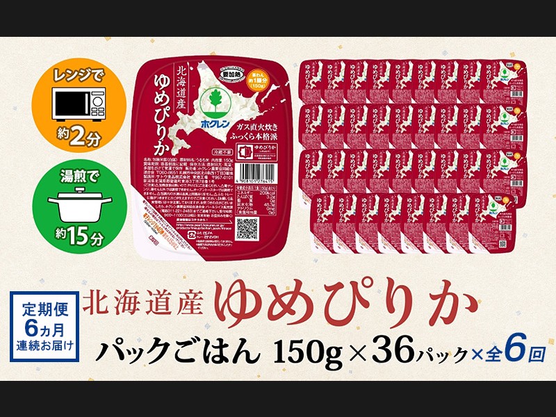 北海道産 『ゆめぴりか』パックごはん(150g) 36パック×全6回をお届けします。