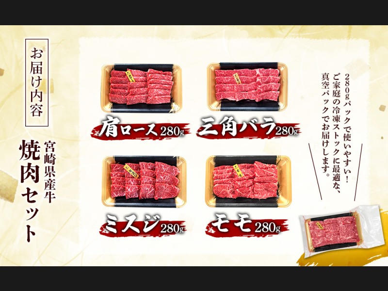 宮崎県産 黒牛 焼肉 赤身 牛肉 焼肉セット 肩ロース 三角バラ ミスジ モモ 4点盛り 1,120g(280g × 4パッ...