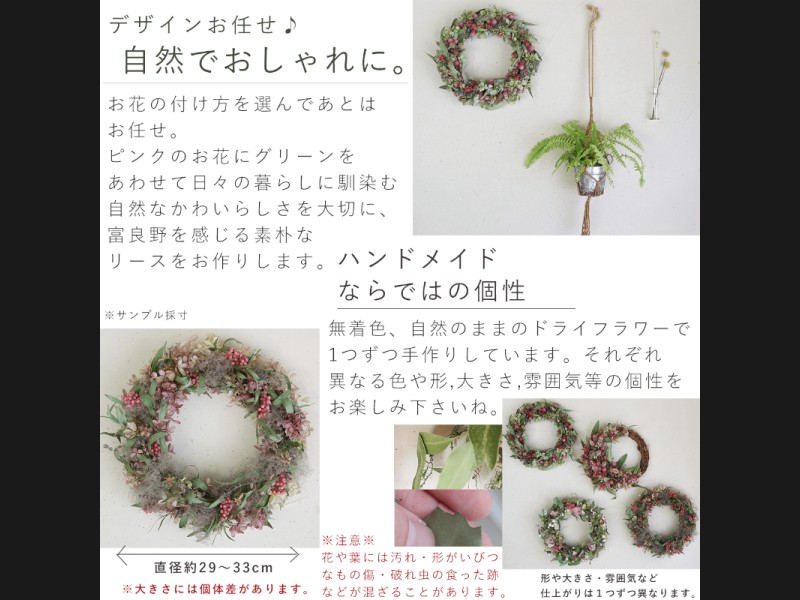 ●自然素材を使用したハンドメイドリースです。形や大きさ、花の付き方、雰囲気に個性があります。