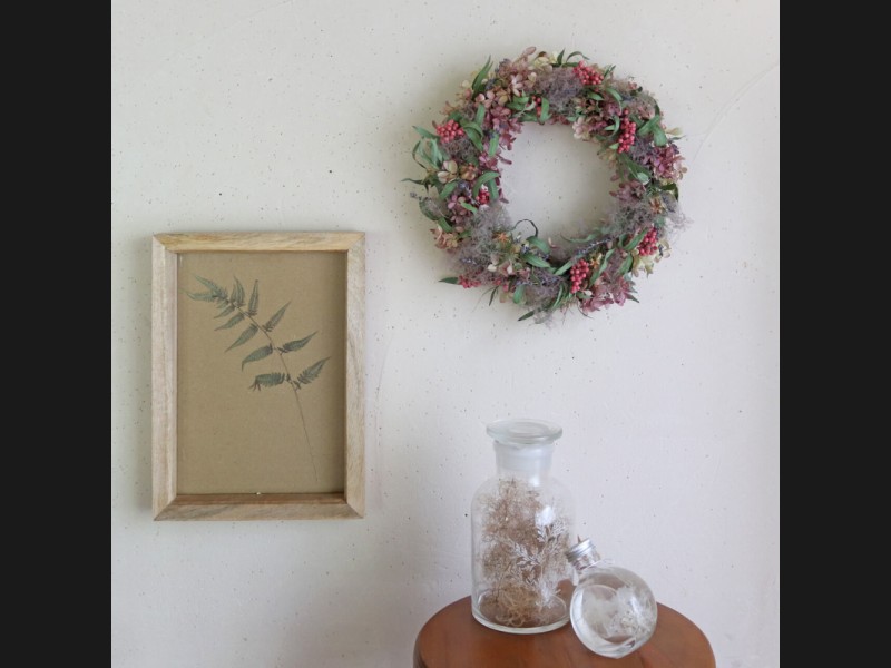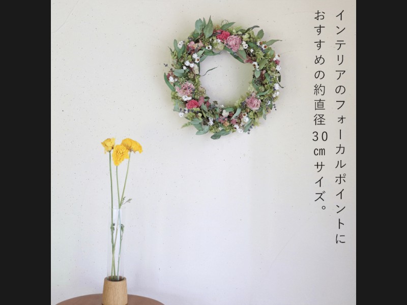 仕上がりサイズがおよそ直径30cmと大きめサイズのリースは1つ飾ってインテリアのフォーカルポイントにするのはもちろん、スワッグやつり下げかご、リースなどとあわせて飾ったり、エントランスなどの空間に飾るのがおすすめ。