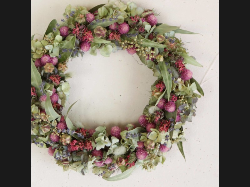 明るい日差しを浴びて輝くドライフラワーリース。