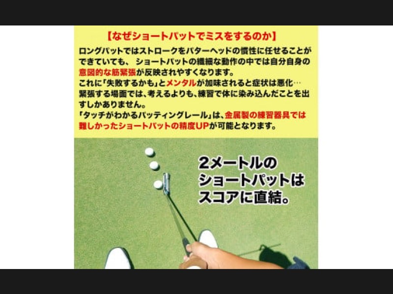 金属製のレール練習器具と最も異なる点は、材質です。パターマット工房製(日本製)の精密なパターマットを使って、手作業で一枚づつ極細にカッティングして仕上げています。タッチ、つまり打感、転がり感、距離感が実際のコースのグリーンを再現しています。自宅で練習したことをコースで再現。方向性だけでなくタッチを学ぶことができるのが当製品「タッチがわかるパット練習レール」です。