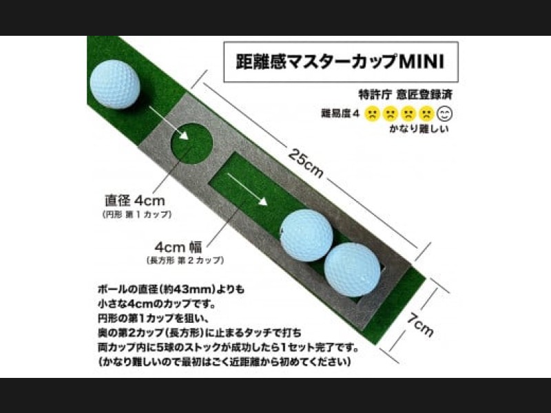 タッチがわかるパット練習レール(ゴルフ練習器具)は、日本製精密パターマットで作った極細レールです。サイズは7cm×200cm。この極細のレールを使って「まっすぐ打つ」に特化したパッティング練習器具です。当工房独自の「ベント芝再現」日本製パターマット"SUPER-BENT(標準)"を使い、幅7cmの極細パッティングマット(レール)に仕上げました。同様の金属製器具と異なり、コースの本グリーン並みの芝スピードと打感を再現していますので、日々の練習で獲得した方向性と距離感の技術を実際にコースで再現することができます。このセットには標準ベント(SUPER-BENT)1枚に距離感マスターカップMINIとラバーリング2個が付属します。(他にも標準・高速・最高速の3種のマットによる3枚、2枚、1枚の各セット商品を出品しています)
