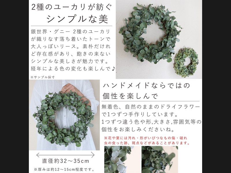 銀世界・グニー 2種のユーカリのドライフラワーをふんだんに使用して素朴でナチュラルだけど存在感のある大きいリースに仕上げました。