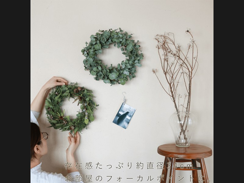 ボタニカルなインテリアやシンプルなディスプレイに人気のユーカリだけを使ったシックだけれどもダイナミックなリースは普段の生活に馴染み、飽きが来ないような大人っぽいデザイン。