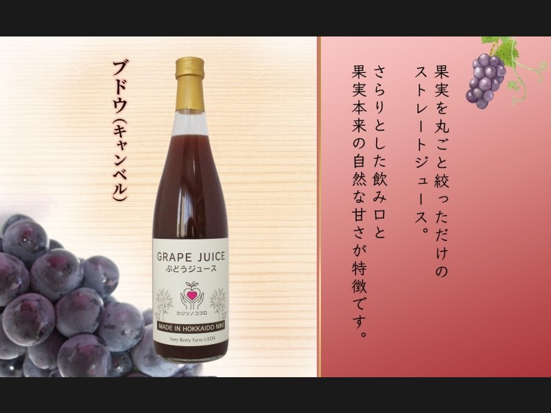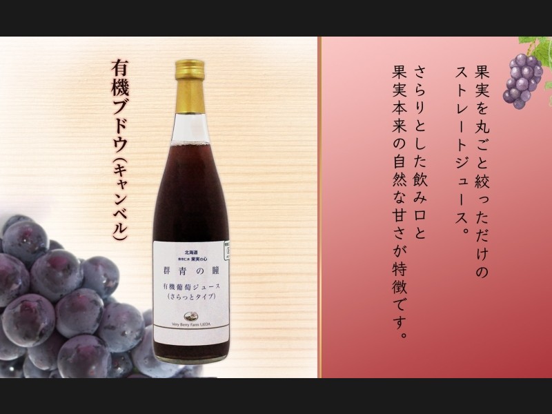 北海道の農園で、人の手で丁寧に有機栽培された「ブドウ(キャンベルアーリー)」をストレートジュースにしました。