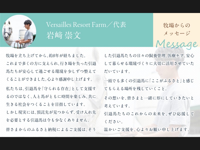 【5万円コース 返礼品無し】より多くの引退馬の幸せな余生を願う Yogiboヴェルサイユリゾートファーム ...