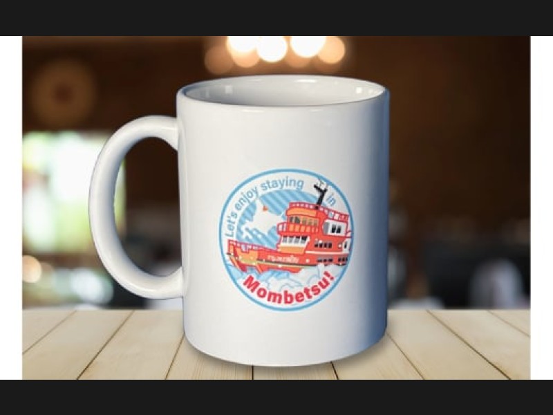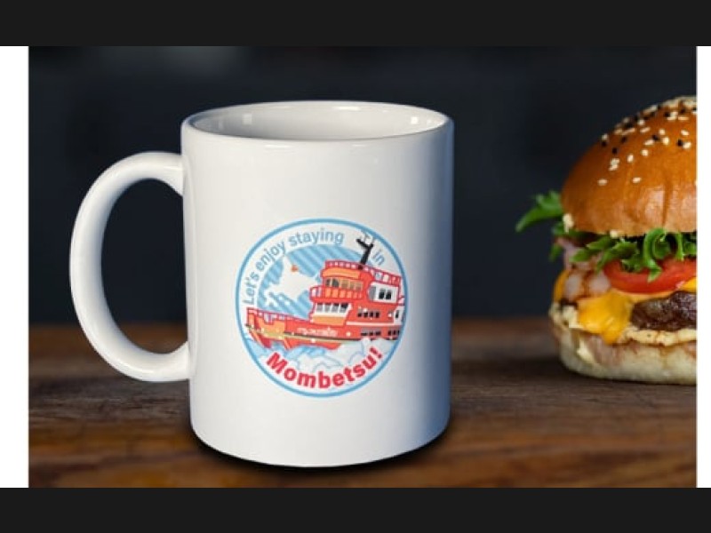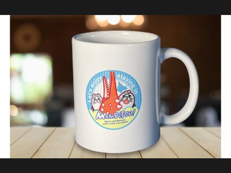 紋別市のマスコットキャラクター紋太とベツ子とカニ爪オブジェ&ガリンコ号3(イメル)のイラストが昇華転写したマグカップです。*背景は、イメージ写真です。