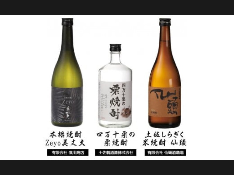 芸西村・仙頭酒造の米焼酎、安田町・土佐鶴酒造の栗焼酎、田野町・濱川商店のZeyoの3本セット。