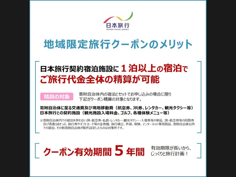 ■北海道以外にも営業展開している施設(チェーンホテル等)に宿泊の場合、クーポンを利用できる金額は1人1泊5万円までとなります。店舗にて都度判断させていただきます。