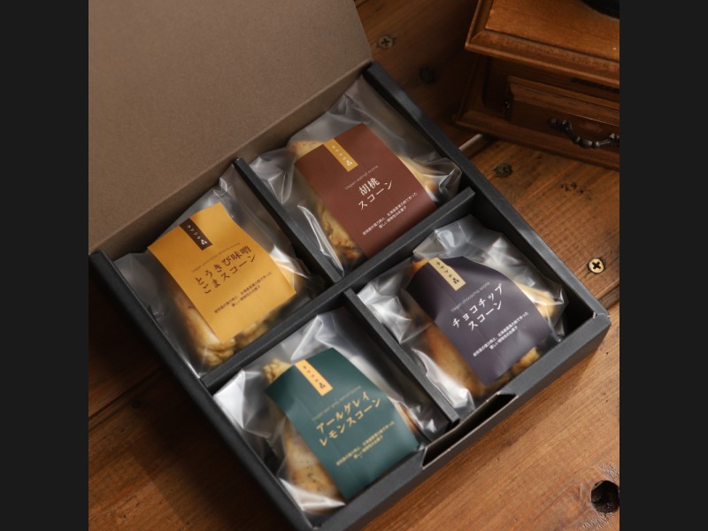 とうきび味噌ごま・くるみ・チョコチップ・アールグレイレモン。4種のスコーンを1個ずつ詰め合わせたセットです。