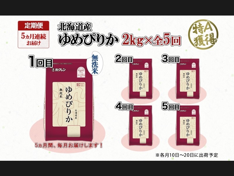 北海道の特A米『ゆめぴりか』無洗米 2kg×全5回をお届けします。