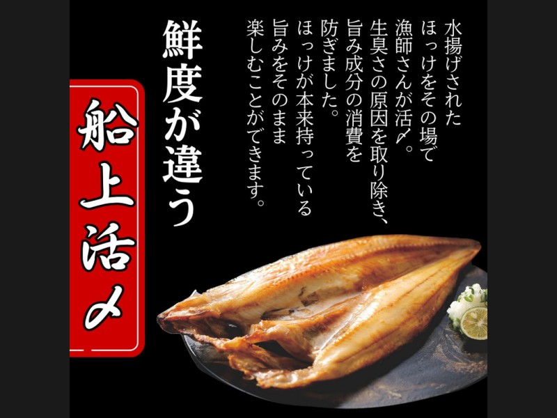 漁師さんが水揚げしたほっけをその場で船上活〆しました。脂ののったそのほっけを一尾一尾手開きで仕上げた贅沢な開きです。鮮度抜群なまま加工した逸品。是非違いをお楽しみください。