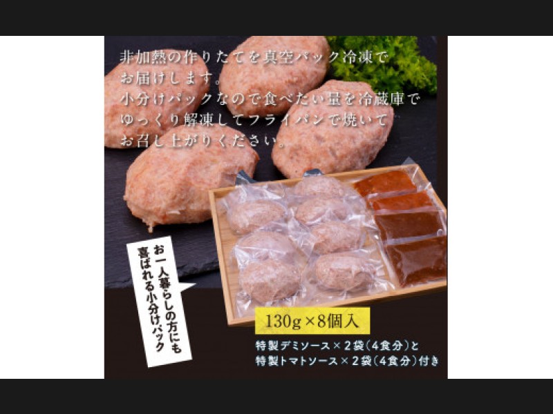 サイズ: 非加熱ハンバーグ130g×8ケ、自家製デミグラスソース100g×2袋、自家製トマトソース100g×2袋