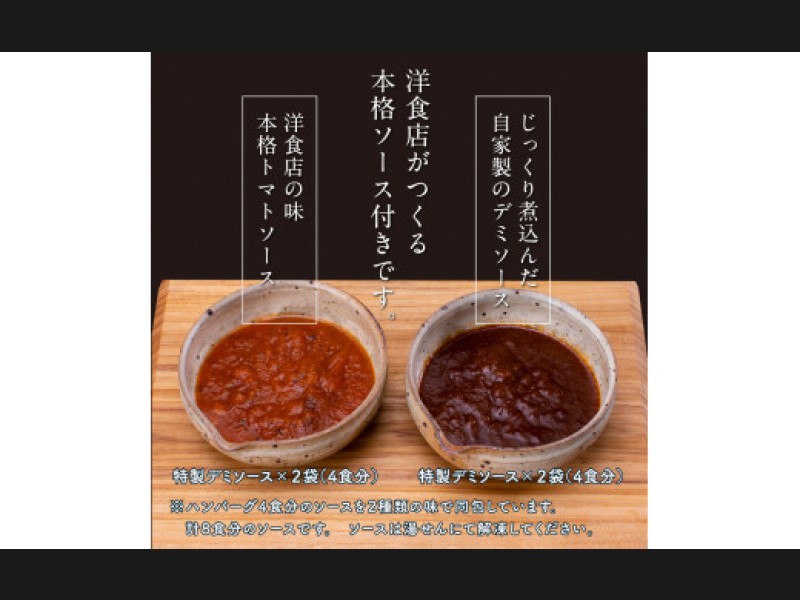 自家製のデミソースとトマトソースを付けておりますので色んな食べ方ができます(各ソース・ハンバーグ2個分)。また、添付のソースだけでなく、おろしポン酢など和風やチーズを乗せるなどバリエーションをお楽しみください。