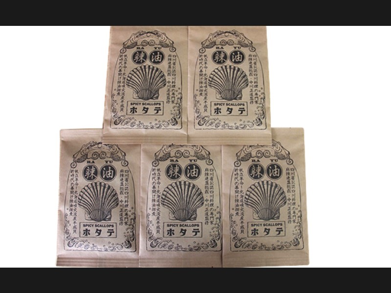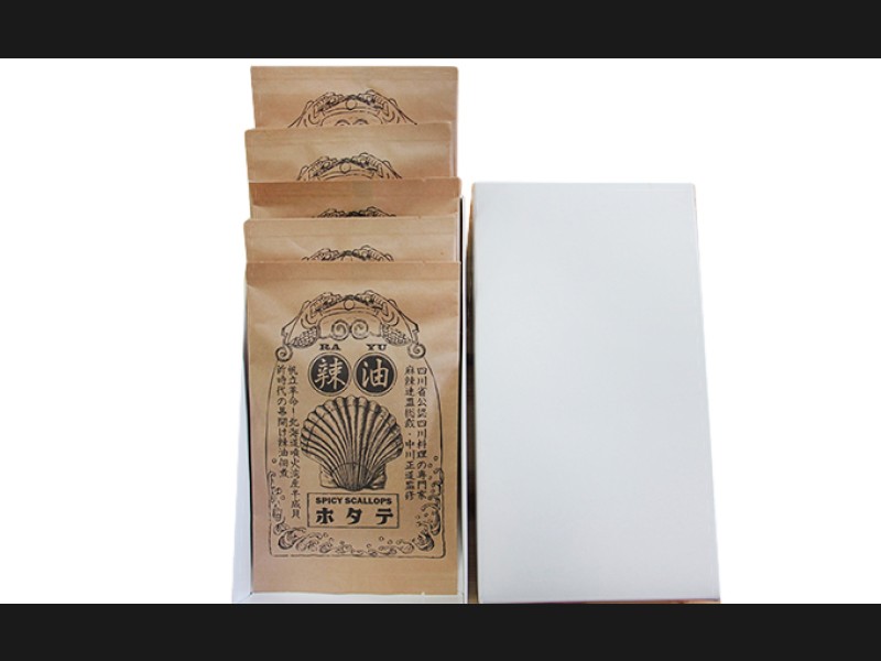 春に地場であがる、ホタテの半生貝(約1年~1年半の生育期間)の旨味を活かした佃煮(甘み)と(辛み)と香りが豊かな麻辣味(マーラー味)を合わせた商品です。