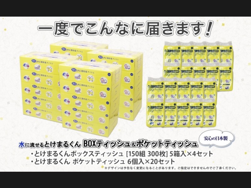水に流せるとけまるくん ティッシュペーパー20箱&ポケットティッシュ120個をセットにしてお届けします。