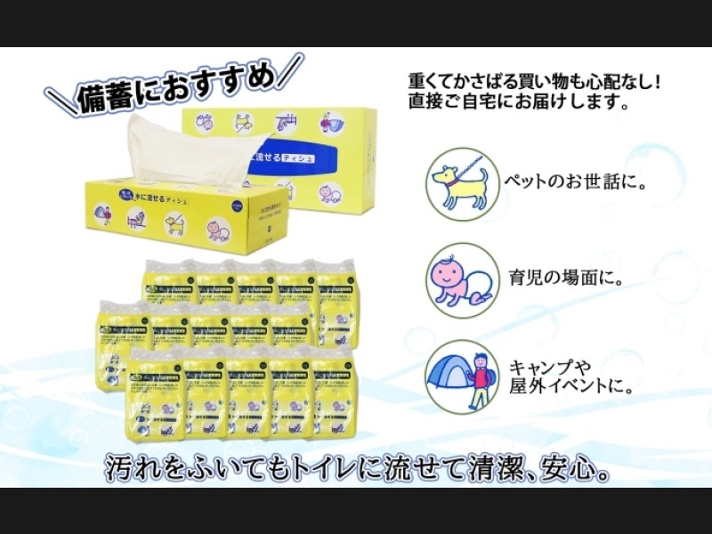 水に流せるティッシュなのでゴミ捨てがらくらく、汚れをふいてもそのままトイレに流せるため清潔、安心です。