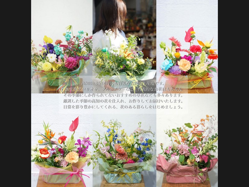 芸西村や高知県で育てられた季節感あふれる旬な生花たちをアレンジにして、心を込めてお届けいたします。お花があるとお部屋が明るくなり、人も笑顔になって何気ない日常が彩り溢れたものになります。毎月季節のお花でお届けいたしますので季節の移ろいも感じていただけます。お花に合わせてラッピングも変えていきますので、お花だけでなく季節に合わせたラッピングもお楽しみいただけます。ご自宅用にも、また贈り物としてもお勧めです。