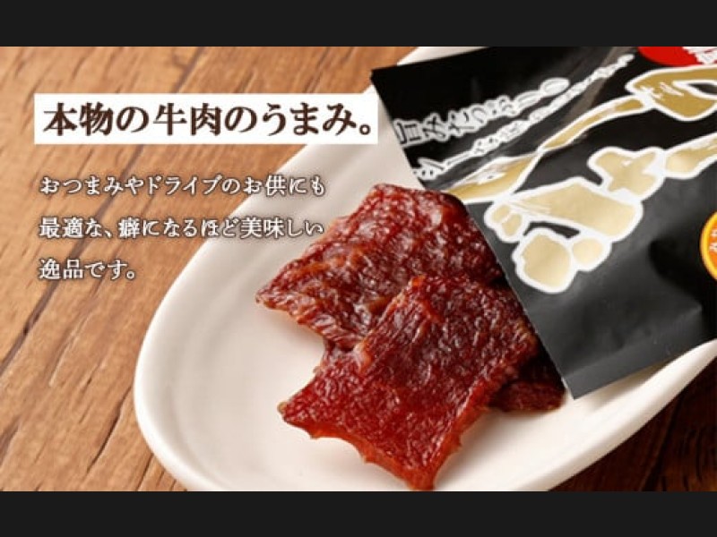 おつまみやドライブのお供にも最適な逸品です。癖になるほど美味しい、本物の牛肉の旨味をご堪能ください。