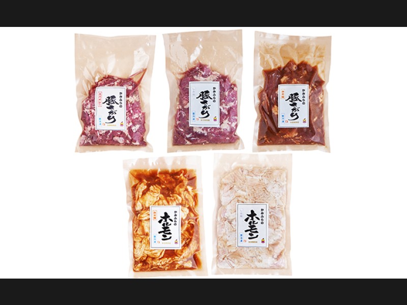 食べやすいように味付をした人気の豚さがり3種をと、自家製だれに漬け込んだ特製豚ホルモン2種をセットにしました。
