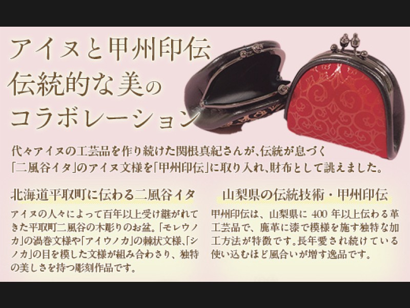 代々アイヌの工芸品を作り続けてきた家庭に育った関根真紀さんが、二風谷イタに施されているアイヌ文様を山梨の伝統的工芸品・甲州印伝に施したコラボレーション商品です。