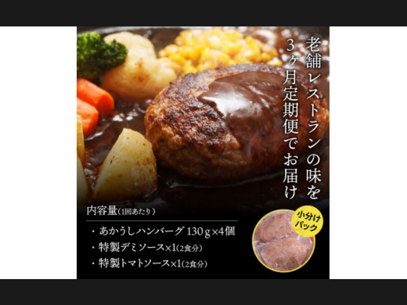 サイズ: 〈非加熱ハンバーグ130g×4コ、自家製デミグラスソース100g×1袋、自家製トマトソース100g×1袋〉×3か月