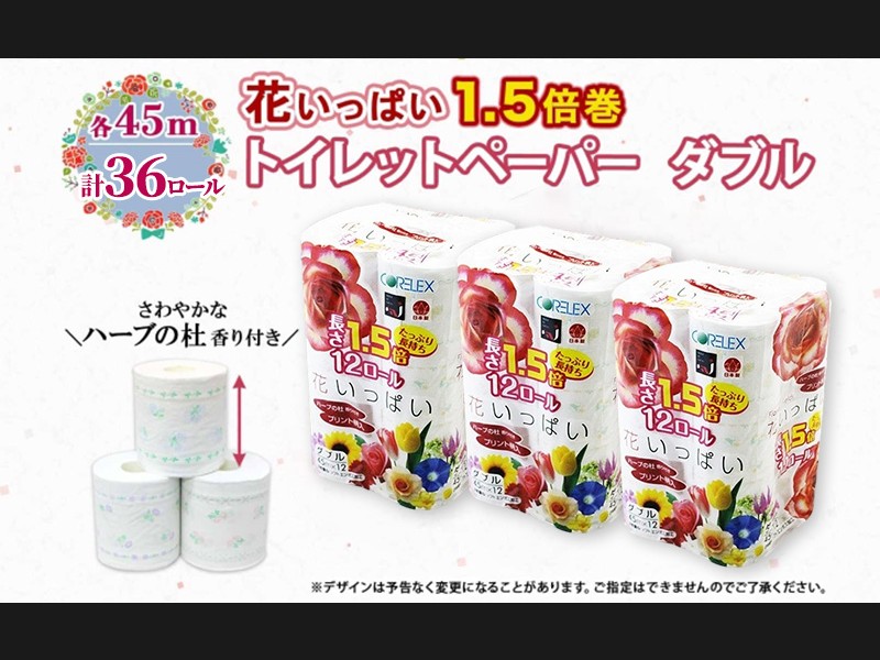 たっぷり長持ち!1.5倍巻き 花いっぱい トイレットペーパー(ダブル)45m 計36ロールセットを2ヵ月毎全3回お届けいたします!