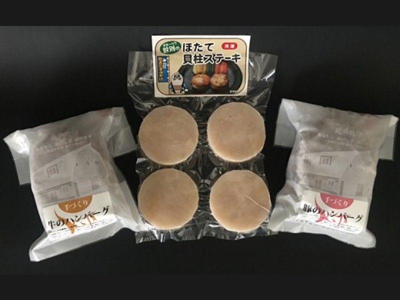 サイズ: ビーフハンバーグステーキ 120g2入×1、ポークハンバーグステーキ 120g2入×1、ほたて貝柱ステーキ50g4入×1