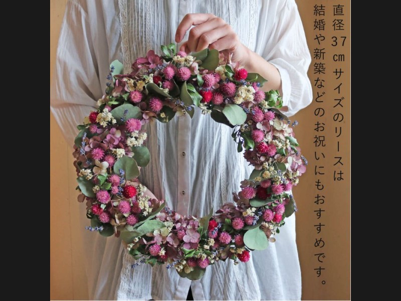 約直径37cmの特大・大きいサイズのドライフラワーリースが届く、お任せセミオーダーリースです。