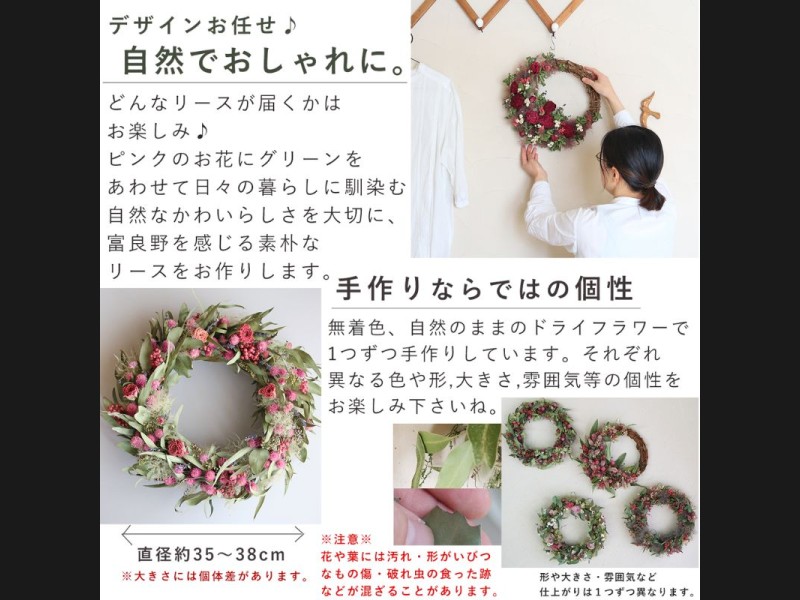 ※自然素材を使用したハンドメイドリースです。形や大きさ、花の付き方、雰囲気に個性があります。