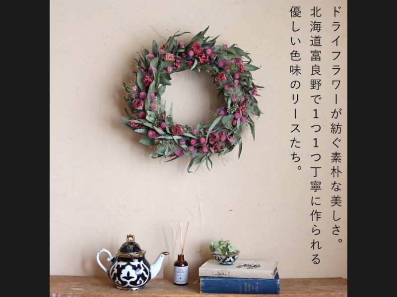 ドライフラワーが紡ぐ素朴な美しさ。 花七曜のこだわりのドライフラワーをつかって北海道富良野で1つずつ丁寧におつくりするリース。