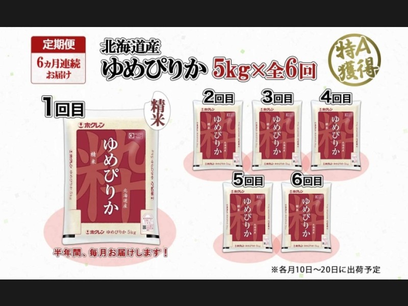 北海道の特A米『ゆめぴりか』精米 5kg×全6回をお届けします。