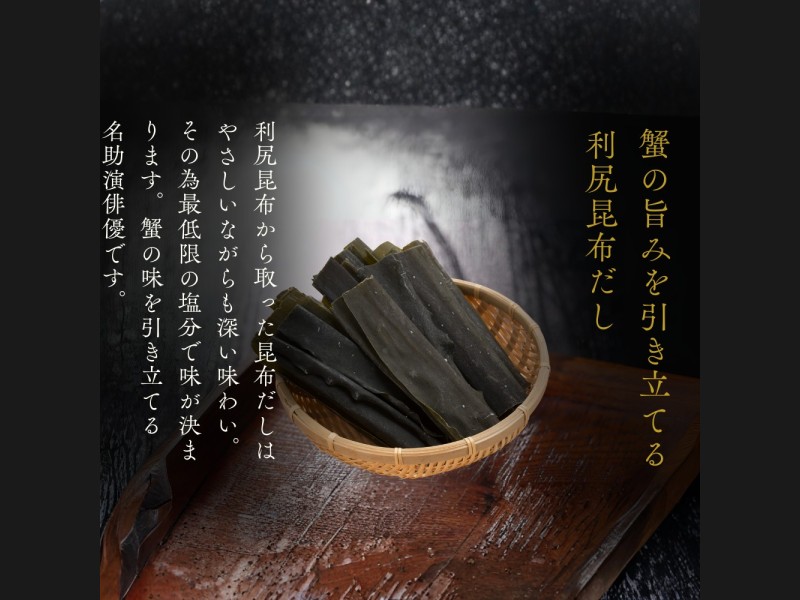 ずわい蟹本来のうまみを感じていただけるよう、添加物は一切使用せず、「ずわい蟹」、「昆布のだし」、「食塩」で仕立てました。