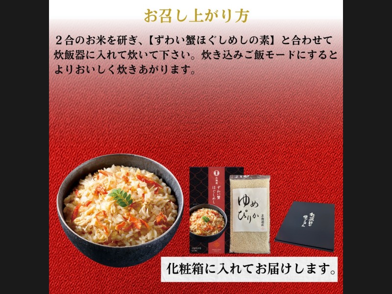 サイズ: ずわいがにほぐしめし410g×1個 ※1個2合炊き用(2人前)、米300g