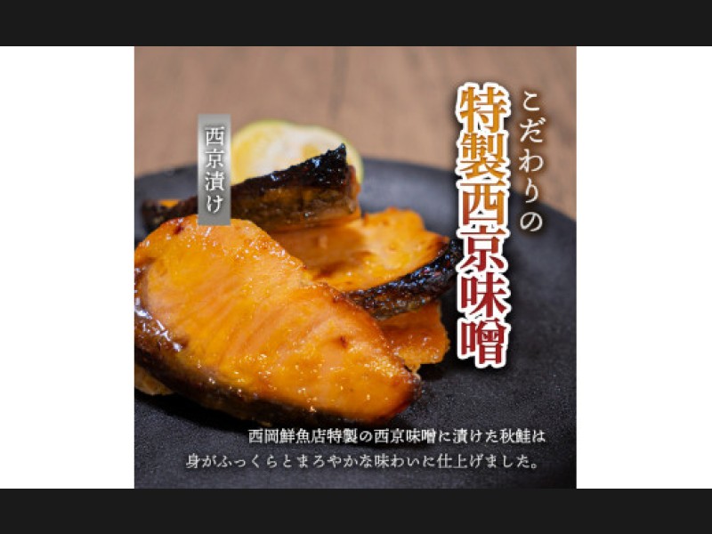 国産天然物の『秋鮭』産卵直前に獲れるため栄養をしっかりと蓄えていることから身がひき締まっており、旨みがあります。更に鮭の旨味を前面に引き出した一品となっております。調理する時やお弁当に入れる際に使いやすいよう小分けカットにしています。西岡鮮魚店特製の西京味噌に漬けた秋鮭は身がふっくらとまろやかな味わいに仕上がりました。素敵な1日の始まりに秋鮭をお召し上がりください。