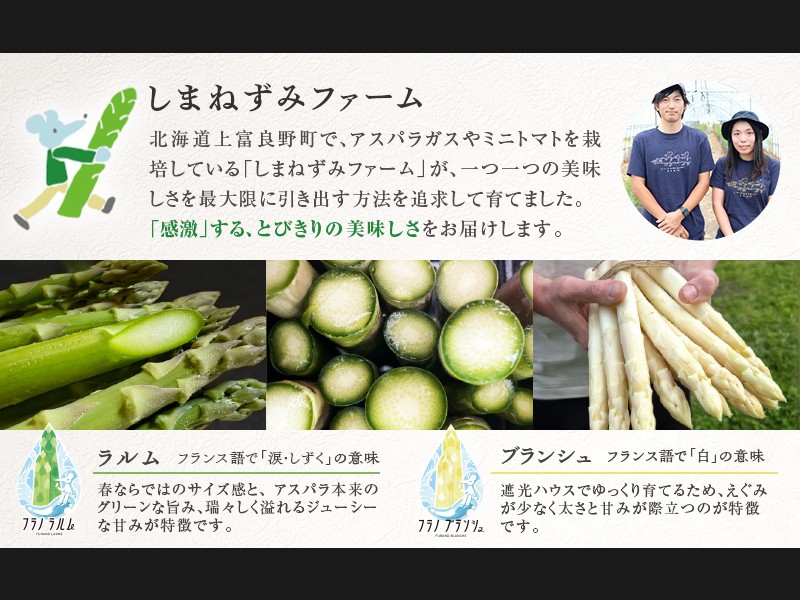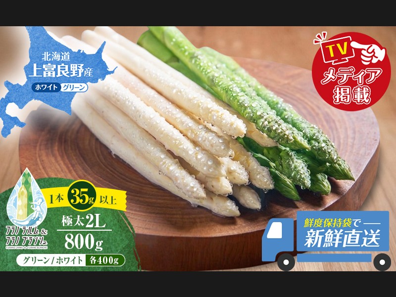 北海道・上富良野町産 グリーンアスパラガス「フラノラルム」&ホワイトアスパラガス「フラノブランシュ」2Lサイズ 800g(目安18~20本)の詰め合わせ。