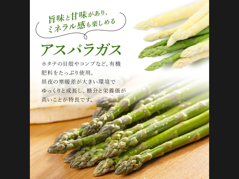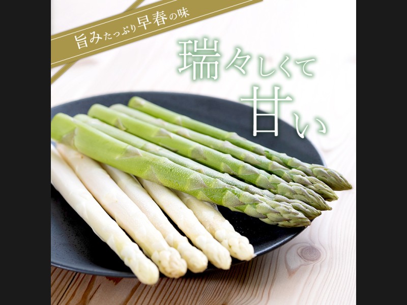 北海道上富良野町で育った、グリーンアスパラガス「フラノラルム」とホワイトアスパラガス「フラノブランシュ」の詰め合わせ。