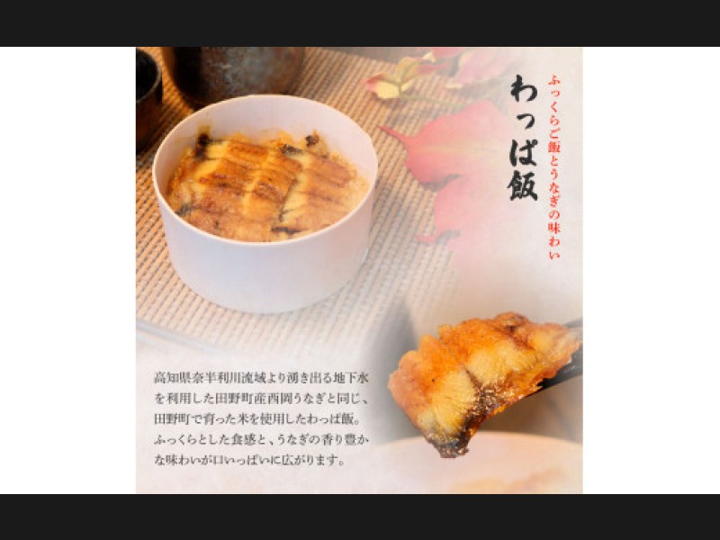 高知県奈半利川流域より湧き出る地下水を利用した田野町産西岡うなぎと同じ、田野町で育った米を使用したわっぱ飯。