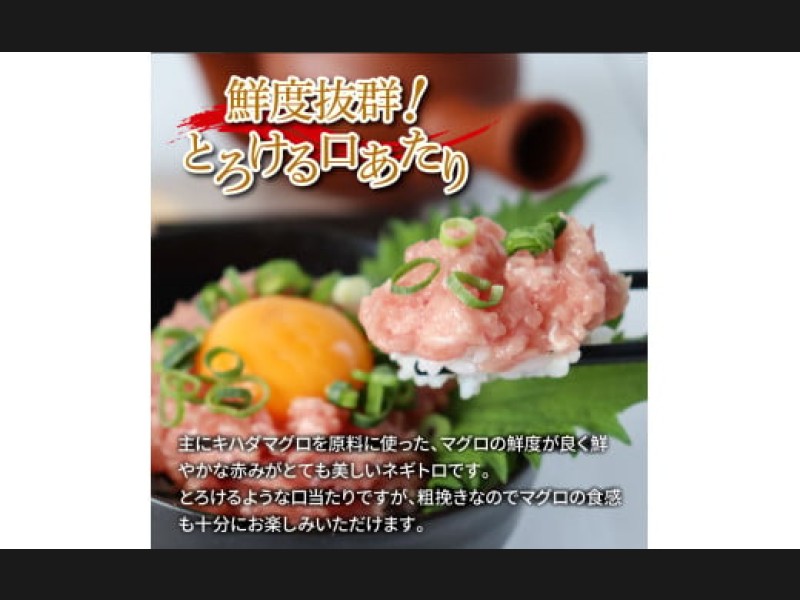 主にキハダマグロを原料に作られたネギトロです。マグロの鮮度が良いので鮮やかな赤みがとても美しいネギトロです。とろけるような口当たりで、粗引きなのでマグロの食感も十分にお楽しみいただけます。脂っぽくなく、魚臭さは一切ありません。新鮮なマグロのうま味を感じていただけると思います。80gというお茶碗サイズにぴったりの小分けパックなので、用途によって使いやすいです。また小分けパックのため解凍にお時間をいただきません。冷蔵庫なら4~5時間程度、お急ぎの場合はボウルに水を張ってその中につけていただければ20~30分程度で解凍が可能です。
