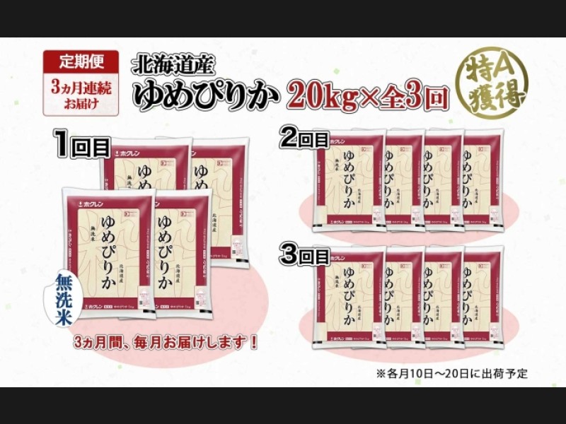 定期便 3ヶ月連続3回 北海道産 ゆめぴりか 無洗米 20kg 米 特A 獲得 白米 お取り寄せ ごはん 道産 ブラ...